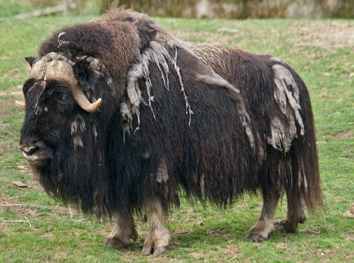 De muskusos is een groot indrukwekkend dier, met zijn ruige, langharige vacht en brede kop met mooie gekromde hoorns.
