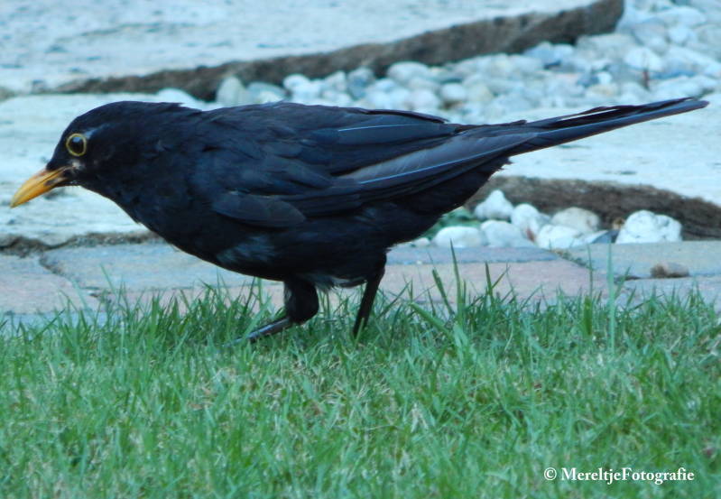 De merel is een veel geziene gast in de Nederlandse tuinen en is ongeveer 25 cm groot. Het mannetje is helemaal zwart met een geel oranje snavel en een cirkel rond de ogen. Het vrouwtje heeft een bruin verenkleed en de snavel is bruin geel. De merel huppelt graag over het gras om met zijn spitse snavel te zoeken naar regenwormen en insecten. Verder eet de merel ook slakken en fruit.