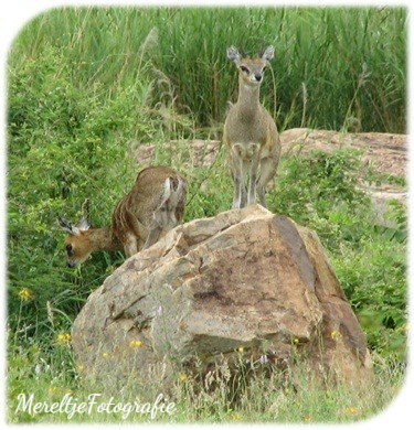 Ook komen er twee klipspringers op onze weg, Steve zegt dat in Afrika verteld wordt dat het geluk brengt, wanneer je een klipspringer of een olifant ziet. Een klipspringer is een kleine antilope, ze eten voornamelijk bladeren.